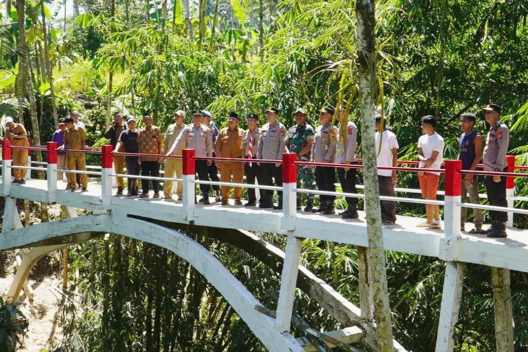 Prosesi peresmian berlangsung khidmat dengan penandatanganan dan pemotongan pita, dilanjutkan pengecekan langsung kondisi jembatan oleh Kapolres dan jajaran.